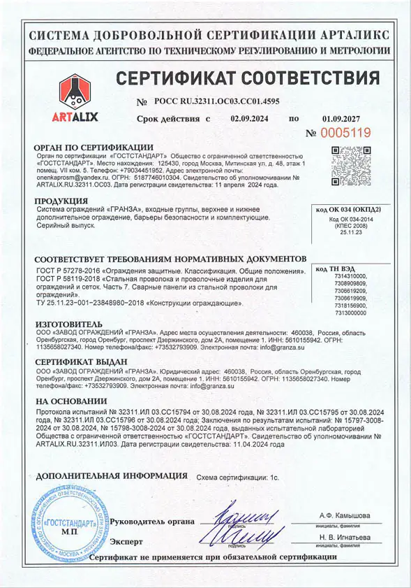 Мы предъявляем самые высокие требования к качеству продукции. В производстве используются сырье и материалы соответствующие государственными и международным стандартам: ГОСТ 3282-74, ГОСТ 13663-86, Регламент REACH (ЕС) No 1907/2006. Продукция «ГРАНЗА» имеет Сертификат соответствия РОСС RU.ВЯ01.H00936 №0339277.
